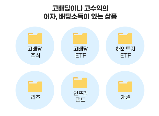 따라서 고수익의 배당∙이자소득이 발생할 것으로 기대되는 상품을 운용하는 것이 합리적이며, 고배당 주식이나 ETF, 해외투자 ETF, 리츠, 인프라펀드, 채권과 같은 상품들이 좋은 예시가 됩니다.