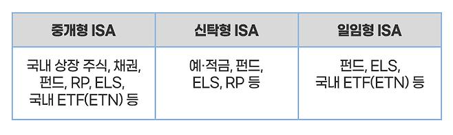 ISA는 하나의 계좌에서 다양한 금융상품을 편리하게 투자할 수 있습니다. 특히 중개형 ISA는 신탁형, 일임형에서 할 수 없었던 국내 상장 주식과 채권에도 투자가 가능합니다.
