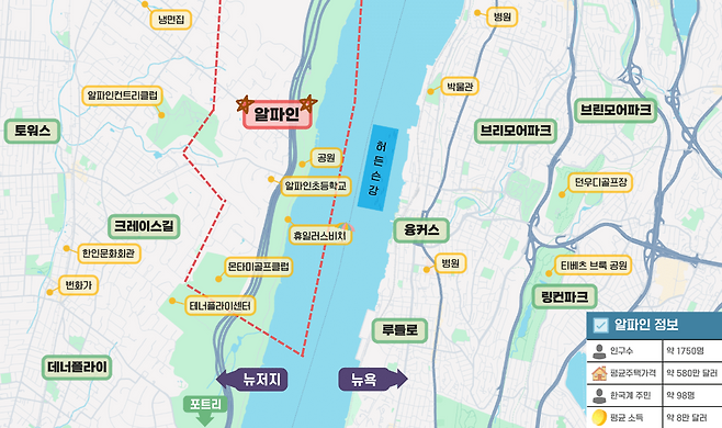 성공한 흑인들이 다수 몰려 사는 곳으로 유명한 미국 뉴저지주 ‘알파인(Alpine)’ 지역이 최근 한국 부자들 사이에서 주목을 받고 있다. 아시아인 중 중국계나 인도계가 많은 다른 미국의 부촌과 달리 알파인은 유독 한국계 주민 비율이 높은데다 인종 차별도 상대적으로 덜한 것으로 유명하기 때문이다. 지난해 기준 알파인 평균 주택 가격은 580만달러(약 85억원)로 미국에서 24번째로 부동산 시세가 높다. 세계 경제의 중심지인 뉴욕 맨해튼과 자동차로 불과 20분 밖에 걸리지 않는데다 알파인과 맨해튼 사이에 위치한 허드슨강 덕분에 외지인 접근이 어려워 사생활 보호나 치안도 우수한 편이다.