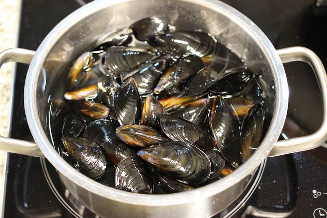 냄비에 손질한 홍합을 담고 홍합이 푹 잠길 듯 말 듯 할 정도로 물을 붓고 강불로 켜요. 입이 벌어지면 부피가 커지기 때문에 조금 큰 냄비를 이용하는 것이 편해요.