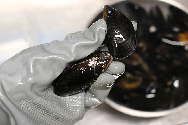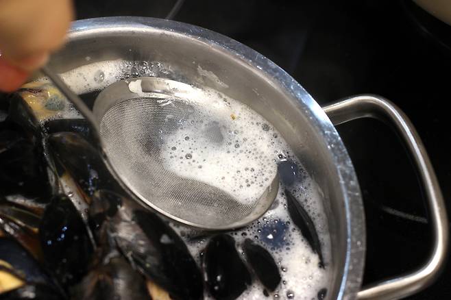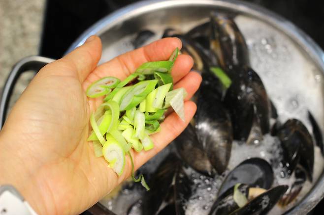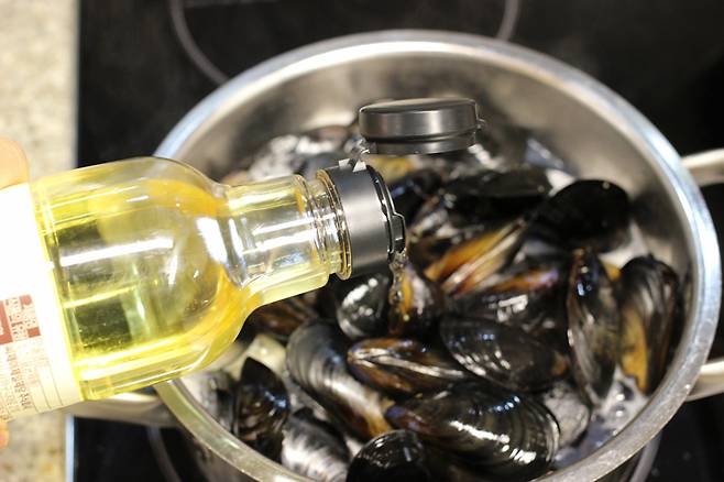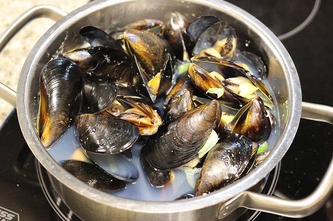 홍합이 입을 벌리기 시작할거예요. 한 번 뒤집어 위아래 위치를 바꿔주고요.