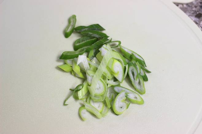 끓기를 기다리는 동안 대파를 총총 썰어요. 얼큰한 국물 맛을 원한다면 청양고추도 썰어주세요.