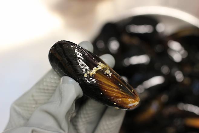 이제 홍합 손질법 시작해볼게요. 홍합은 바위에 붙어 자라기 때문에 이렇게 족사라는 것이 있어요. 발 역할을 하는 실이라는 뜻인데 조개를 닫은채로 족사를 잡아 살살 움직이면 뜯어져요. 족사가 있는 채로 삶으면 식감이 별로이기 때문에 깔끔하게 떼주는 것이 좋아요.