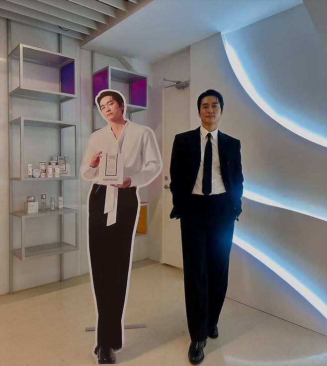 함께 등장한 오가나셀 광고판 속 화이트 셔츠 스타일과의 대비도 흥미롭다. 판넬 속 송승헌은 헐렁한 실루엣의 셔츠와 와이드 슬랙스로 보다 유연하고 부드러운 이미지를 연출하며, 현재의 블랙 슈트 룩과 극명한 대비를 이룬다. 이는 브랜드 이미지와 배우 본인의 다면적인 매력을 동시에 부각시키는 연출로도 읽힌다.
