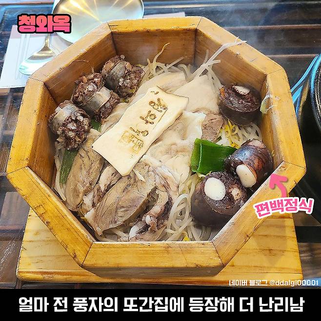 일단 이곳은 외관부터 내부까지 우리나라 전통의 느낌으로 고풍스러운 느낌이 확 나요. 유재석은 청와옥에서 순대국을 한 그릇 뚝딱 해치우는 모습을 보였는데, 얼마 전 풍자의 또간집 을지로편에서 등장한 맛집이라고 하니.. 여기 진짜 웨이팅 어마어마하겠네요.