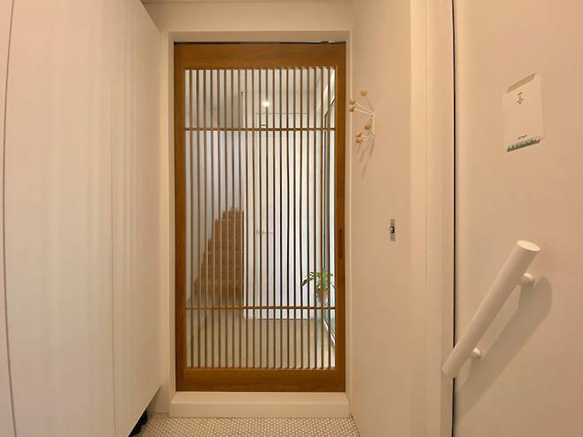 현관 공간. 간살 도어가 무게감 있게 자리하고 있어요.