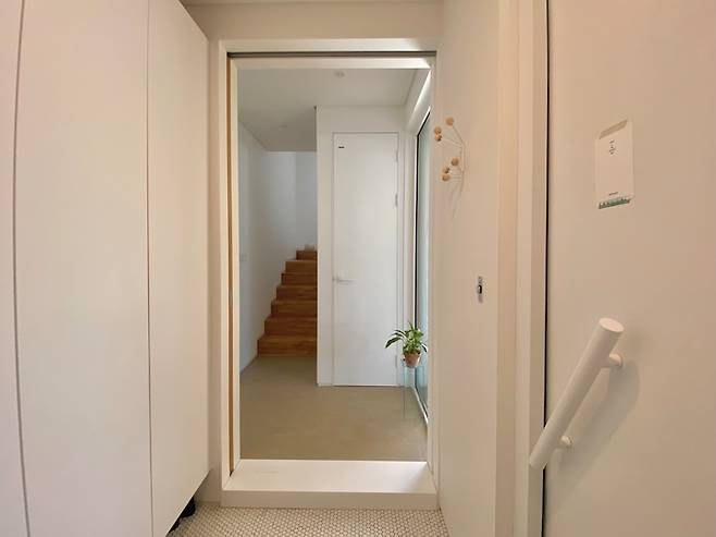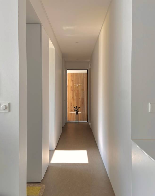 2층으로 가거나 외출을 할 때, 복도 풍경입니다. 현관을 들어와서 바로 주방과 거실이 노출되는걸 원하지 않았어요. 그래서 복도로 거리감을 두었죠.