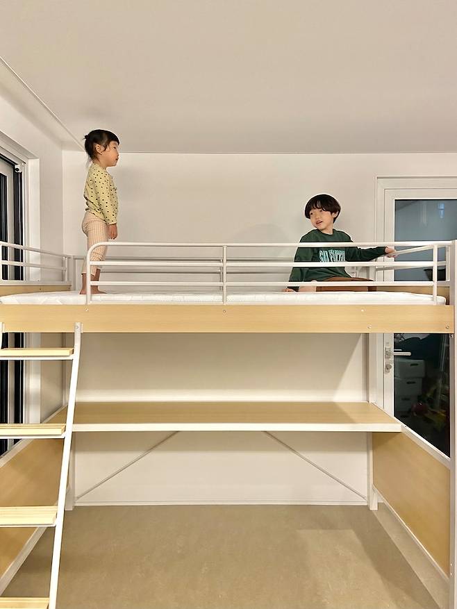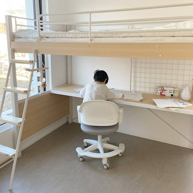 초등학생인 첫째는 2층 침대에 대한 요구가 확실했어요. 아래에는 책상이, 위는 슈퍼 싱글 사이즈의 침대로 꾸려져 있어요. 아직은 둘째 방에서 네 가족 모두 같이 자지만, 언젠가 짧은 미래에 저기서 혼자 자게 되겠죠? :)