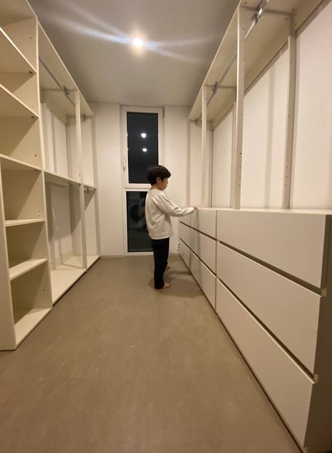 아이들 방은 좌우 대칭으로 같은 구조를 하고 있어요. 첫째가 왼쪽 방, 둘째는 오른쪽 방을 쓰기로 했어요. 붙박이장도 같이 맞췄고, 방에서 나가는 테라스는 함께 공유해요.