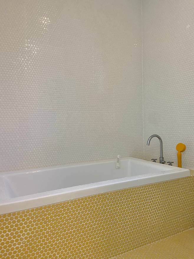 여기도 마찬가지로 화이트와 옐로우 페니 타일로 시공 했어요. 노랑노랑한 욕조 속에 아이들이 들어가 있으면 더 사랑스러운 그림이 나온답니다.