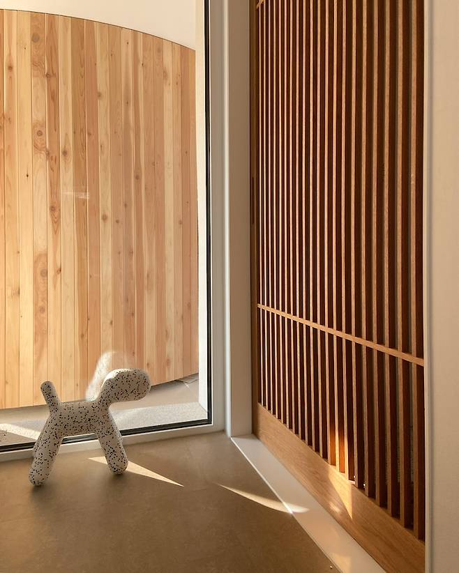 원목의 간살 중문과 외부 방킬라이 목재가 따스한 느낌이에요.