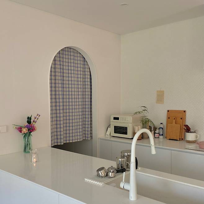 새하얀 주방을 원해서 깨끗한 톤을 유지했고, 곳곳에 소품들은 무얼 놔도 어울리는 하얀 도화지 같은 주방이에요. 수전과 후드, 싱크볼과 인덕션 모두 화이트 입니다.