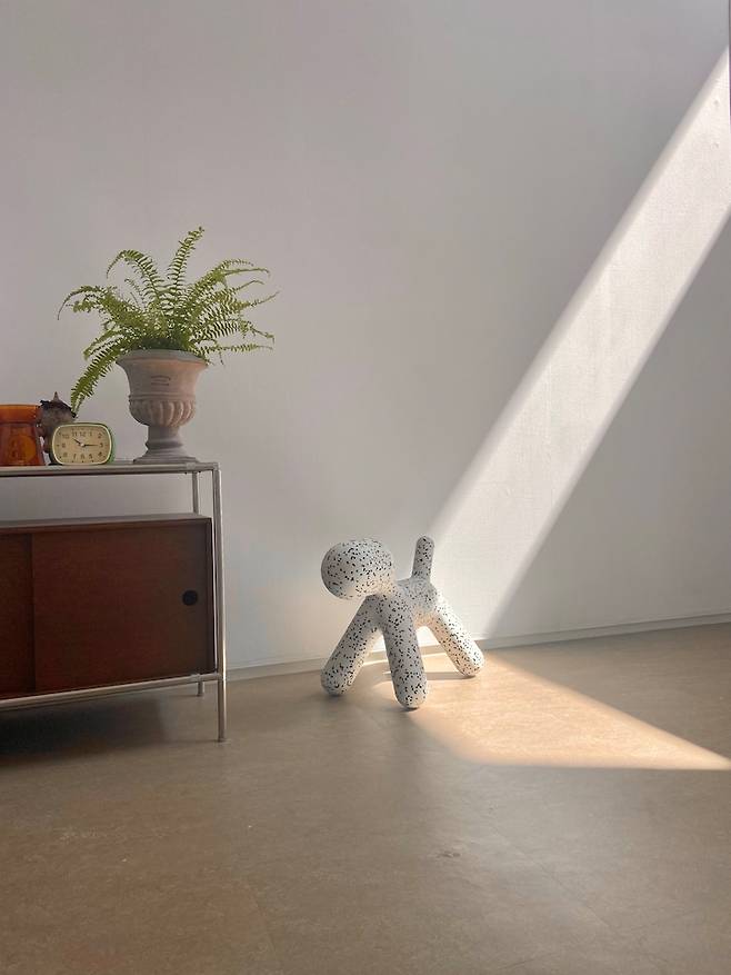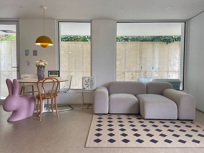 가족이 모이는 저희 집 식탁 입니다. 원형이라 손님이 와도 의자만 더 두면 충분합니다. 의자는 세트가 아닌 가족이 각각 원하는 디자인으로 골랐어요. 기분에 따라 바꾸어 사용하기도 한답니다. 핑크 토끼 의자는 토끼를 좋아하는 둘째의 픽이랍니다. 노란 식탁등도 우리 집에서는 '계란 후라이'로 통하는 시그니처 입니다. 하얀 바탕의 집이라 다양한 색을 사용하여 과하지 않게 포인트를 주었어요.