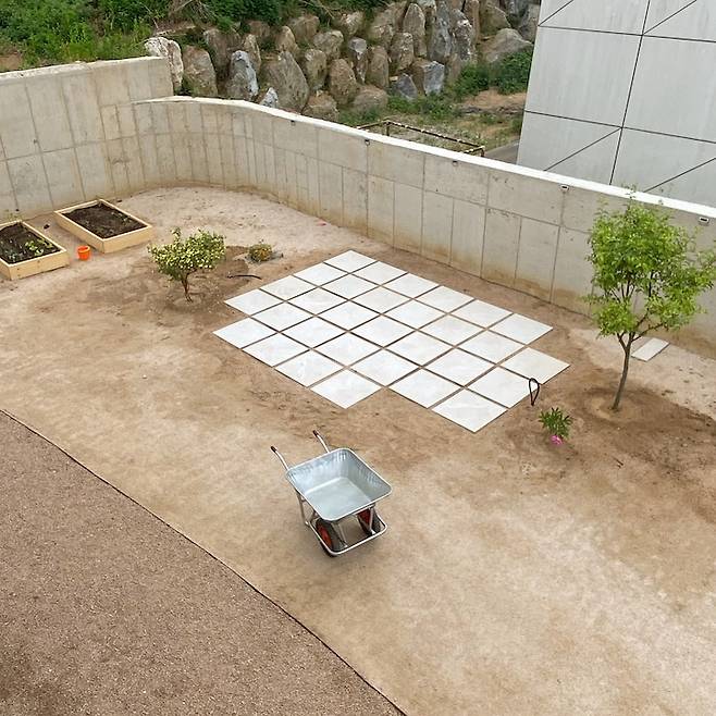 집 건축 당시, 콘크리트와 철근 자재 값이 폭등해서 예상보다 많은 예산이 지출되었어요. 그래서 조경은 저희 부부가 조금씩 해보기로 마음먹었어요. 건물 앞쪽은 철판 엣지로 구획을 나누어 왕마사를, 다른 쪽은 잔디를 식재했어요.