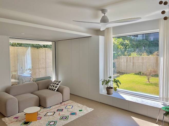 집들이 꽤 있는 마을이라 프라이빗한 거실 생활을 누리고 싶었어요. 마당에는 옹벽이 있어 프라이버시를 지킬 수 있고, 창은 개방감 있게 하여 어느 정도 밝고 개방감 있게 활용하고 있어요.