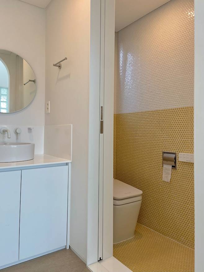 오른쪽은 화장실. 아이들이 가장 많이 사용하게 될 화장실과 욕실이라 페니타일을 화이트와 옐로우를 섞어 귀여운 느낌을 주었어요. 눈치 채셨겠지만 타일이 대부분 페니타일로 통일되어 있어요. 설계 당시 페니 동전 크기의 동그란 페니타일의 매력에 푹 빠졌거든요.