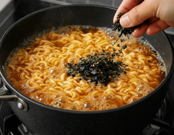 이는 라면 스프의 강한 짠맛을 부드럽게 감싸주면서 국물맛의 밸런스를 잡아주는 효과로 이어진다. 김가루가 적은 양만으로도 단맛, 짠맛, 감칠맛 사이의 조화를 잡아주는 역할을 한다는 점에서 단순한 부재료 이상의 의미가 있다.