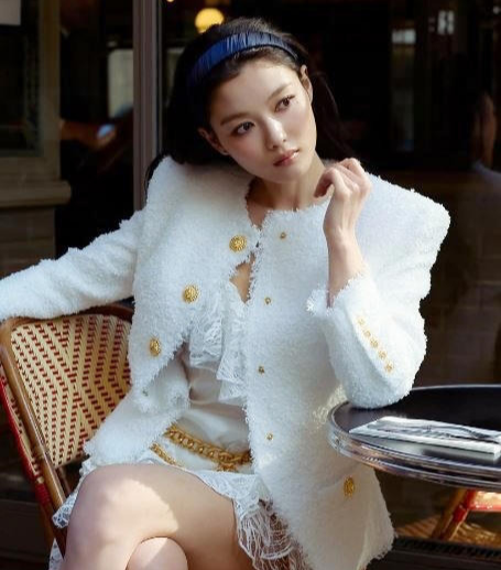 화이트 트위드 재킷에 골드 단추 디테일, 그리고 짧은 슬립 원피스를 매치해