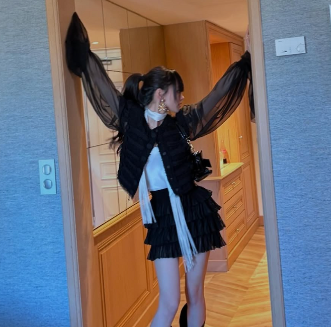 화이트 타이 블라우스에 블랙 시스루 자켓을 매치하며 세련된 시크룩을 선보였다.
