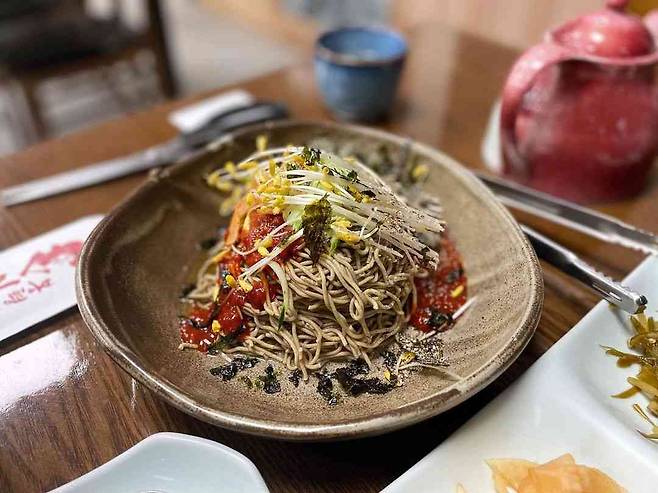 ▲가격: 이대팔 100% 메밀 '미가연' 12,000원, 메밀싹 육회 25,000원