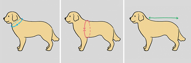 강아지 목둘레, 가슴둘레 그리고 등길이를 체크해 주세요. 그리고 옷을 고를 땐 목둘레와 가슴둘레가 실제 사이즈보다 약간 큰 제품을 고르는 게 편안하게 입히기 좋습니다. 등길이의 경우 조금 짧아도 괜찮은데요. 만약 보온이 목적이라면 최대한 등 길이와 맞춰서 구매하는 게 좋답니다.