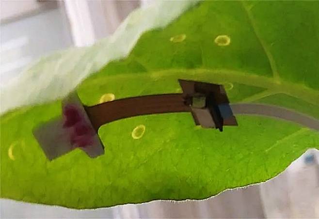 이 장치는 식물 잎사귀에 부착할 정도로 작다. 스트레스를 받은 식물이 발신하는 SOS 신호를 센서로 감지하고 전기신호로 바꿔 사람에게 전달하는 구조다.