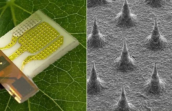이번 웨어러블 디바이스는 플라스틱 마이크로 니들이 핵심이다. 이 초미세 바늘의 표면은 키토산과 식물 유래 효소를 섞은 물질로 코팅돼 과산화수소가 닿으면 전류가 흐른다. 이를 식물의 잎에 붙이면 조직에 박힌 마이크로 니들이 스트레스 반응을 즉각 검출한다.