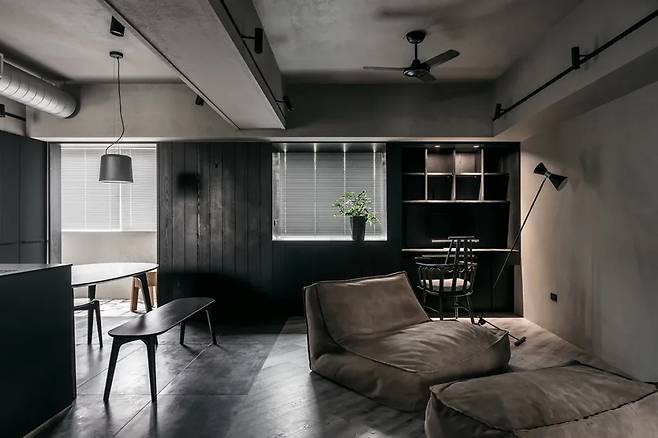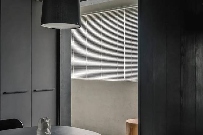 서재는 창가의 빈 공간에 자연스럽게 이어지며, 검은 목재로 마감한 벽면이 벽 구조를 분산시키는 역할을 합니다. 수납은 맞춤형 책장으로 설계되어 실용성과 심미성을 동시에 만족시킵니다.
