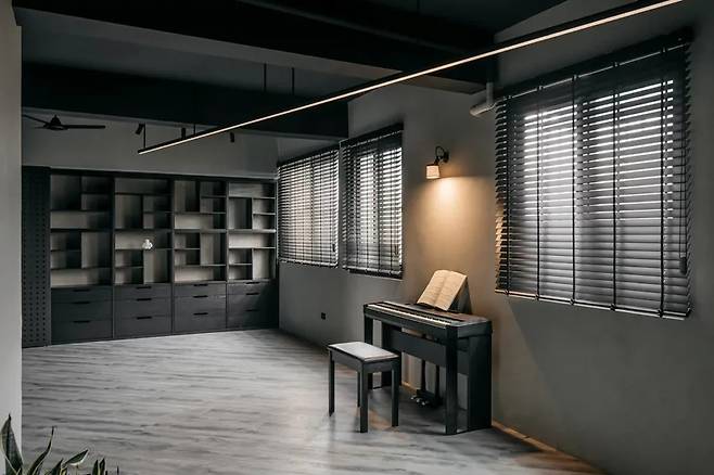 멀티룸의 벽을 철거한 후 확장된 운동 공간은 시각적, 물리적으로 개방감이 뛰어납니다. 피아노가 놓여 있어도 운동에 불편함이 없으며, 작업실은 벽 없이 설계되어 시선이 부드럽게 이어집니다.