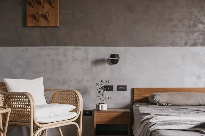침실은 전반적으로 차분하고 자연스러운 소재들로 구성되어 있습니다. 강렬한 검정과 회색의 톤은 이 공간에서 멈추며, 따뜻한 목재 바닥을 중심으로 이탈리아산 벽 마감재가 메인 벽면에 사용되었습니다.