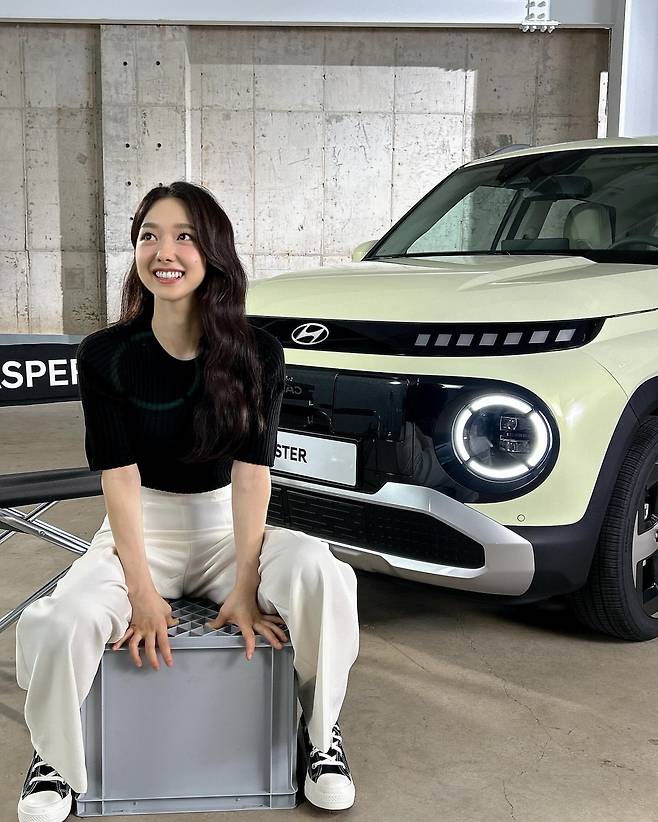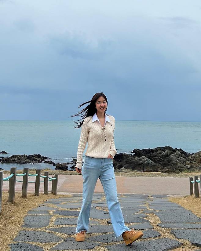 밝은 색상의 니트와 데님 팬츠를 매치하여 편안하면서도 스타일리시한 캐주얼룩을 선보였다. 니트 안에 셔츠를 레이어드하여 밋밋함을 덜고, 데님 팬츠는 부츠컷 디자인을 선택하여 트렌디함을 더했다. 자연스러운 헤어스타일과 미소가 전체적인 룩에 활력을 불어넣는다.
