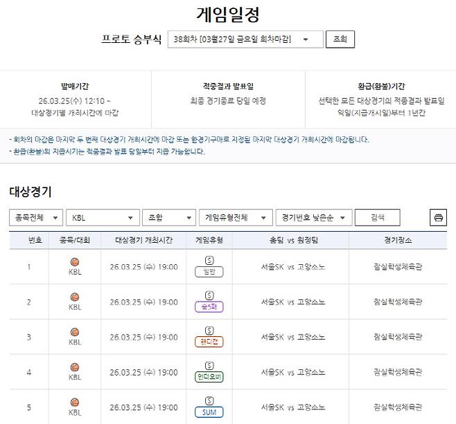 서울올림픽기념국민체육진흥공단이 발행하는 체육진흥투표권 스포츠토토의 수탁사업자 한국스포츠레저가 25일 오후 7시에 잠실학생체육관에서 열리는 2025~2026 KBL 서울 SK(홈)-고양 소노(원정)전을 대상으로 한 프로토 승부식 38회차 게임이 발매 마감을 앞두고 있다고 밝혔다.