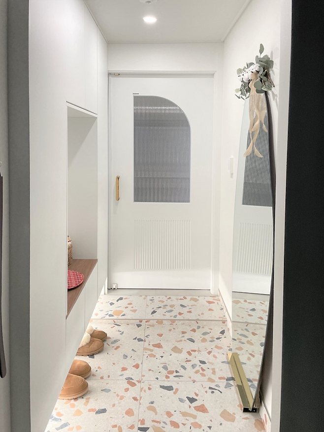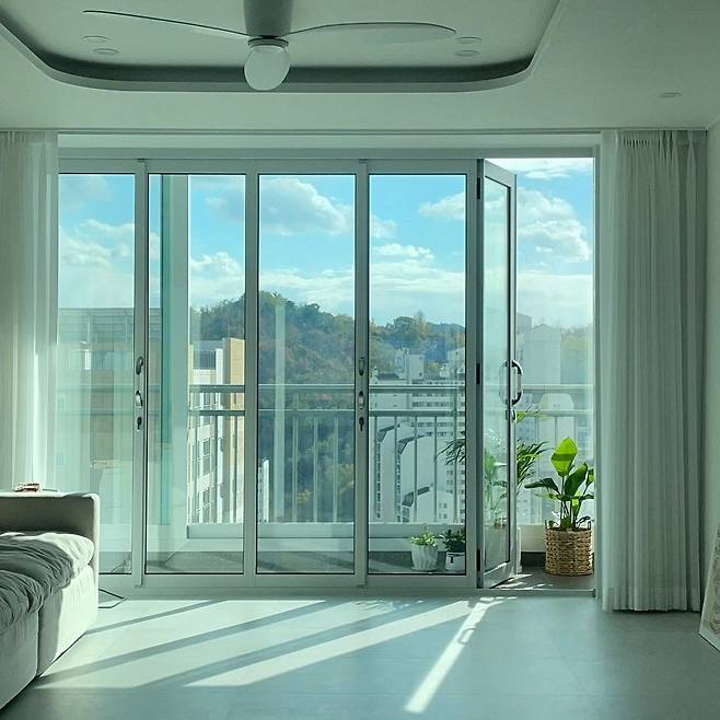 또 아파트 베란다가 주는 느낌이 좋았고 작은 평수도 아니라 베란다 확장을 하지 않고 거실에 히든 폴딩 도어를 설치했어요.