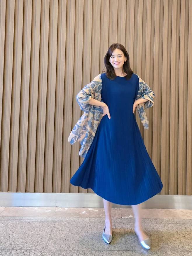 또 다른 사진에서는 딥한 블루 컬러의 플리츠 원피스에 화려한 패턴의 가디건을 매치해 또 다른 매력을 발산했다. 동일한 디자인의 원피스라도 함께 연출하는 아우터에 따라 전혀 다른 분위기를 낼 수 있음을 보여주는 좋은 예다. 이처럼 플리츠 원피스는 단독으로 입으면 화사하고, 가디건이나 재킷을 걸치면 차분한 무드를 연출할 수 있어 활용도가 높다.