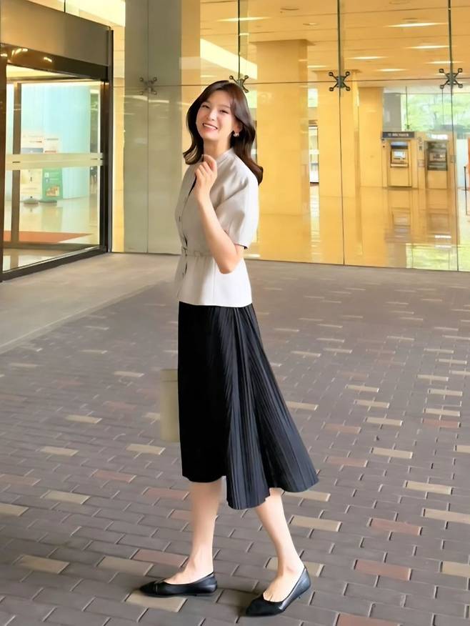 원피스뿐만 아니라 플리츠 스커트를 활용한 오피스룩 스타일링도 선보였다. 베이지색 벨티드 상의에 블랙 플리츠 롱스커트를 매치해 단정하면서도 여성스러운 매력을 극대화했다. 활동성을 보장하는 플랫 슈즈를 더해 편안함까지 놓치지 않았다. 그녀의 스타일링은 출근룩은 물론 하객룩, 주말 나들이룩으로도 손색이 없어 많은 여성들의 워너비 스타일로 떠오르고 있다.