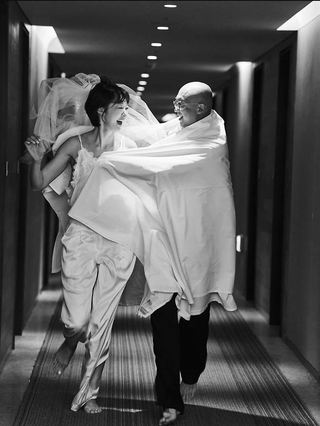 실크 슬립 드레스에 베일을 매치한 호텔 복도 촬영에서는 장난기 어린 모습으로 사랑스러운 신부의 매력을 뽐냈습니다.