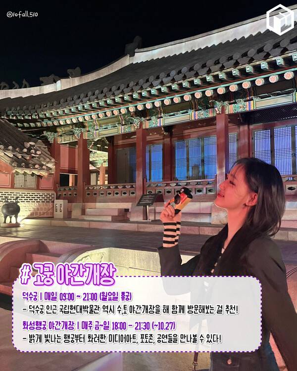 복원이 끝나 은은한 조명이 비추는 행궁과 다양한 미디어아트 그리고 각종 공연과 포토존이 여름밤을 다채롭고 유쾌하게 보내기 좋아 추천드리는 야간 데이트코스입니다.