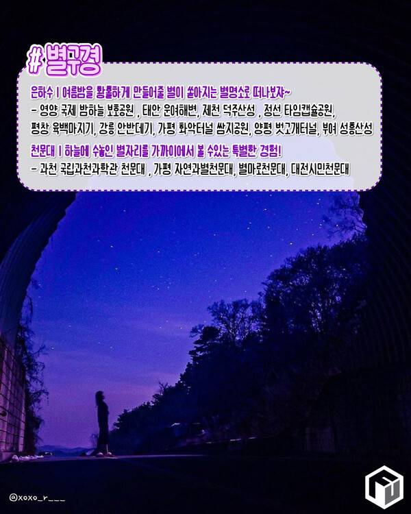 밤하늘을 빼곡히 채운 별과 쏟아지는 별들의 향연을 감상할 수 있는 국내 은하수 명소에서는 밤하늘을 보며 황홀한 풍경에 취할 수 있어 추천드립니다.