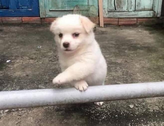 이것이 바로 진정한 애교임을 몸소 보여주는 시골집 강아지가 있습니다. 하얀 듯하면서도 누런 듯한 묘한 색깔을 뽐내고 있는 이 뽀시래기 강아지가 그 주인공입니다.