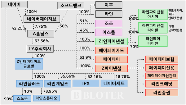 라인플러스는 경기 성남시에 본사를 두고 있지만 일본 라인야후의 자회사다. 네이버와는 관계기업으로 분류된다. 라인플러스의 최대주주는 라인야후가 지분 100%를 보유한 Z인터미디어트글로벌이다. 라인야후의 최대주주는 네이버와 소프트뱅크가 지분을 절반씩 보유한 A홀딩스다. 이에 따라 라인플러스의 최상위 지배기업은 소프트뱅크다.
