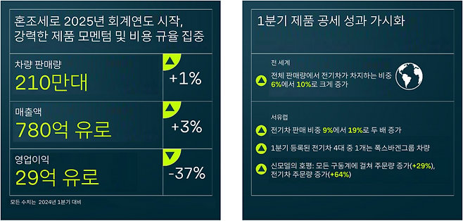 폭스바겐 그룹의 25년 1분기 매출은 776억 유로로, 전년 동기 대비 2.8%가 증가했다. 특히 중국을 제외한 시장에서의 차량 판매가 호조를 보였다. 프로그레시브 브랜드 그룹, 파이낸셜 서비스 사업 부문의 매출도 늘었다. 이러한 증가세는 스포트 럭셔리 브랜드 그룹 및 트라톤 부문의 매출 감소로 인해 둔화되었다.