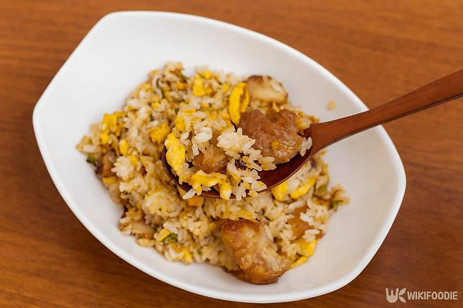 치킨은 부위별로 맛 차이가 있다. 다리 살은 쫄깃하고 가슴살은 담백하다. 기름에 볶을 때는 먼저 파 1/2개를 썰어 넣어 향을 내고, 계란 2개를 풀어 볶은 뒤 밥과 치킨을 함께 넣는다. 마지막에 간장 1스푼과 굴 소스 1스푼을 넣어 불향을 살리면 집에서도 볶음밥 전문점 같은 맛이 난다.