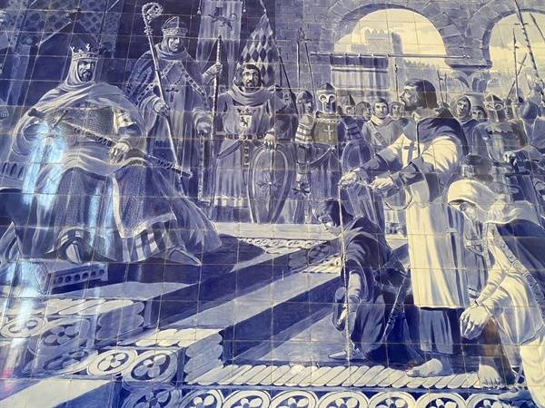 세밀하게 묘사된 여러 그림 중 누군가 무릎을 꿇고 있는 장면이 특히 궁금했다. 찾아보니 포르투갈 건국의 일등 공신인 에가스 모니스가 레온 왕국의 알폰소 7세 앞에 용서를 빌고 있는 모습이다. 옆에서 무릎을 꿇고 있는 사람들은 그의 가족들이다.