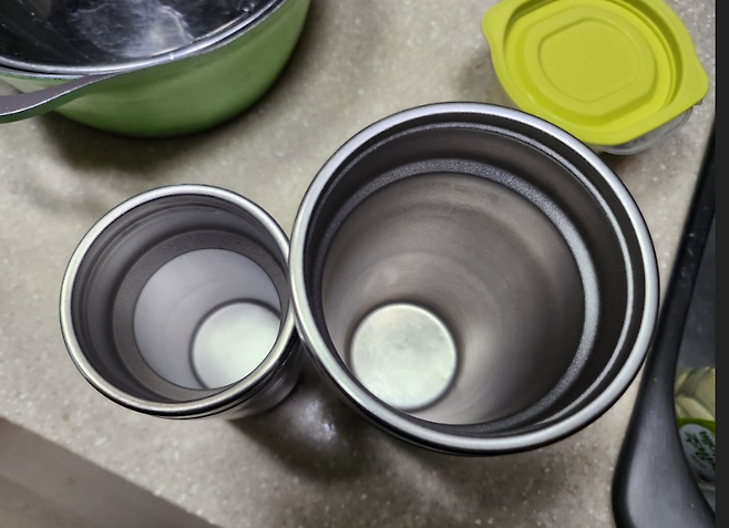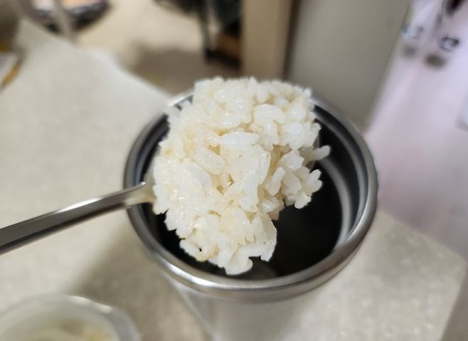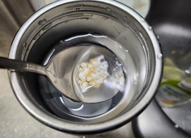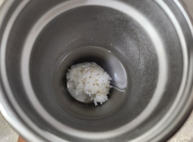 먼저 텀블러 안에 따뜻한 쌀밥 한 숟가락을 넣습니다. 가능하다면 갓 지은 밥이 가장 좋습니다. 오래된 밥은 전분이 굳어 효과가 다소 떨어질 수 있습니다. 그다음 40~50도 정도의 따뜻한 물을 텀블러 2/3 정도까지 채워줍니다. 너무 뜨거운 물은 스테인리스 표면을 변색시킬 수 있으니 주의하세요.