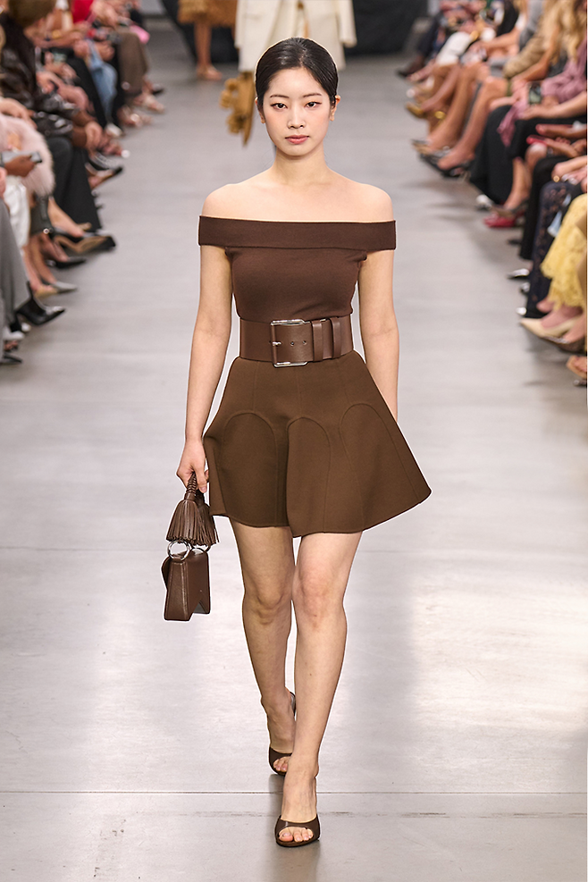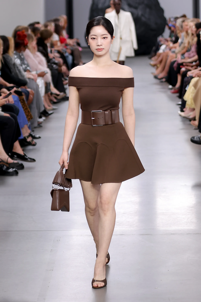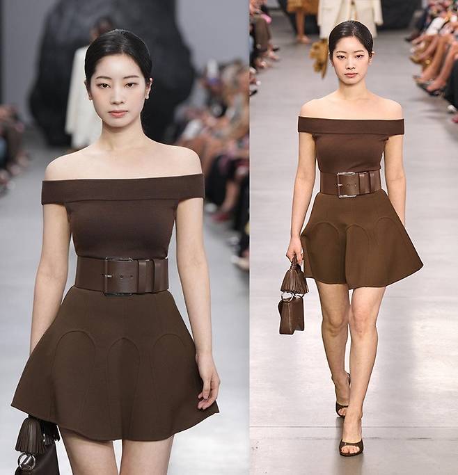다현은 쇼가 시작되자 플레어 스커트 라인의 오프숄더 벨티드 미니 드레스룩으로 런웨이 무대를 질주하며 K팝 스타의 위엄을 발산했다.