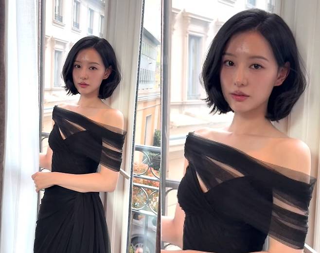 공개된 사진 속 김지원은 어깨 라인이 드러나는 블랙 오프숄더 드레스를 입고 카메라를 응시하고 있다. 특히 새롭게 선보인 짧은 단발 스타일과 투명한 피부가 어우러지며 마치 동화 속 백설공주를 연상시키는 청초한 분위기를 자아냈다.