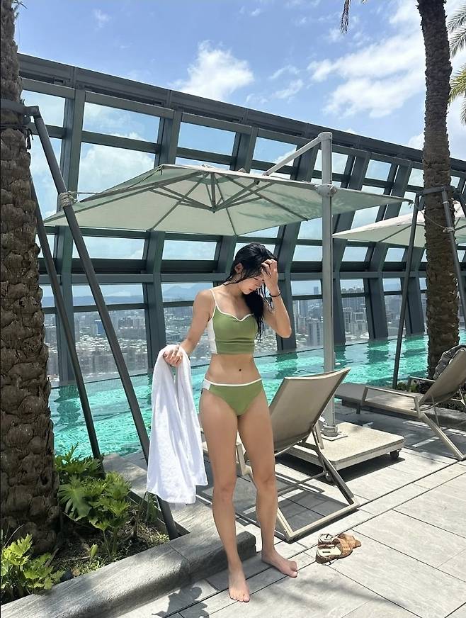 김민지는 그린 컬러의 브라탑 스타일 비키니를 선택해 스포티하면서도 시크한 수영복 스타일을 선보였습니다.