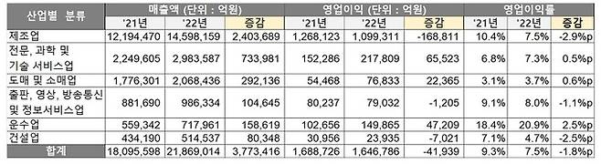 특히 제조업은 13%의 큰 감소율을 보인 데 이어 영업이익률도 2.9%포인트(10.4%→7.5%) 떨어졌다.