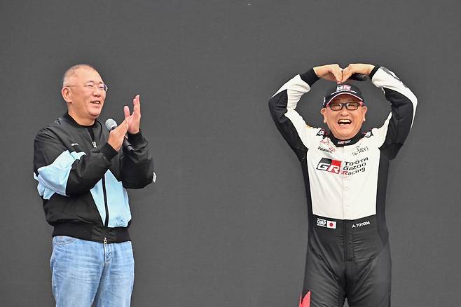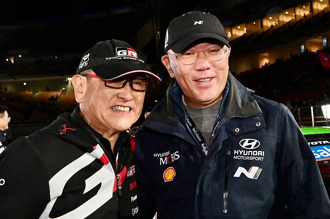 그로부터 한 달여 뒤인 지난해 11월 24일, 일본 나고야 인근에서 치른 2024 시즌 ‘세계랠리선수권대회(WRC)’ 마지막 라운드인 일본 랠리 시상식장에서 그를 다시 만났다. 이날은 제조사 부문 우승을 거둔 토요타 그룹의 도요다 아키오 회장으로 현장을 찾았다. 드라이버 부문에서 우승한 현대차 그룹의 정의선 회장과 축하 인사를 주고받아 눈길을 끌었다.