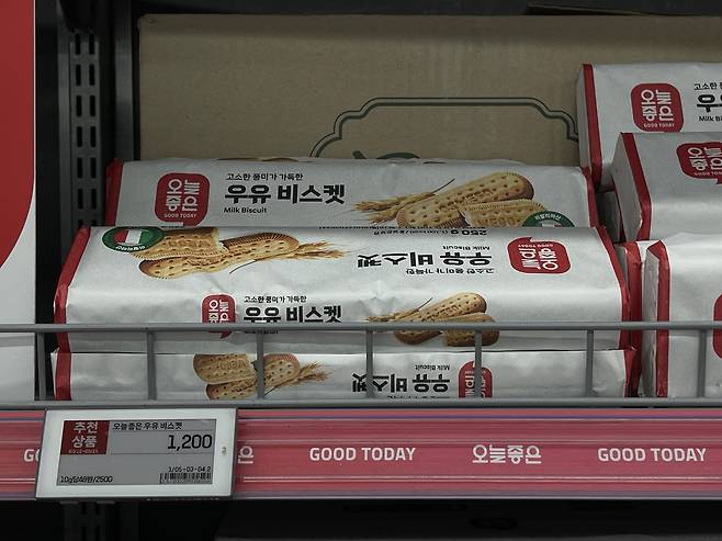 롯데마트 오늘좋은 우유 비스킷은 부드럽고 고소한 우유 맛이 특징이에요.
